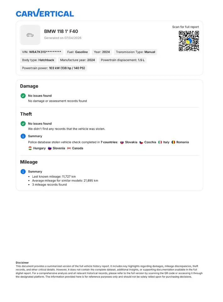 BMW 118 iA M-Sport Edition is a clear on-request option for a client who wants to choose the vehicle before purchase and see the estimate in advance: 2024, mileage 15,000 km, automatyczna, 136 hp. Before purchase, we check the seller, documents, photo-based condition and specification, then prepare a turnkey delivery estimate.