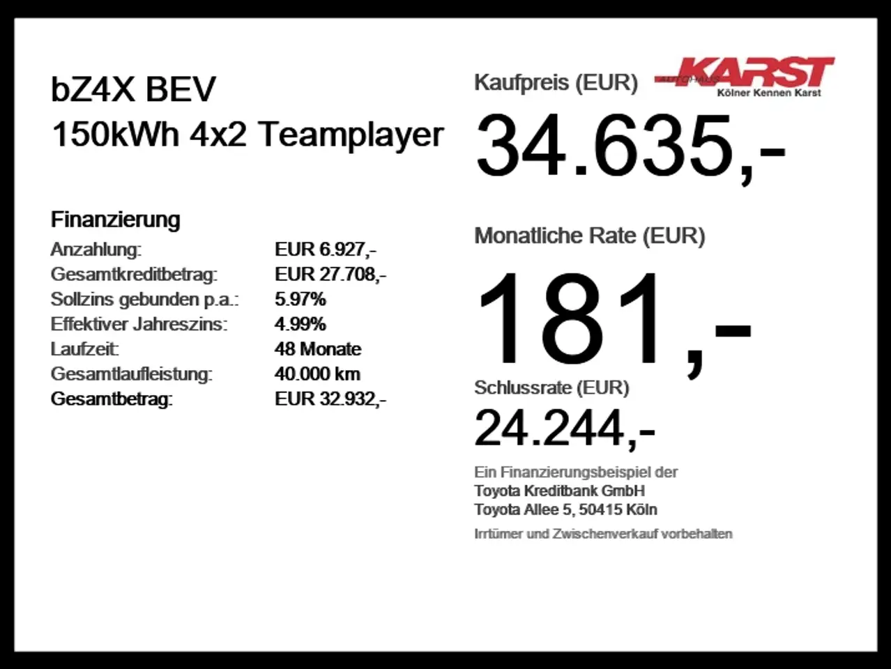 The listing states: 2025, mileage 2,000 km, Elektryczne, Automatyczna, 205 hp. KARST Toyota Vertragshändler · Köln · DE. Price guide: 3,057,668 ₽. This is the vehicle price in the country of dispatch; the final amount including delivery, customs and paperwork is calculated separately before a purchase decision. There are enough photos to review the body, interior, lighting, wheels and general condition before requesting a calculation.