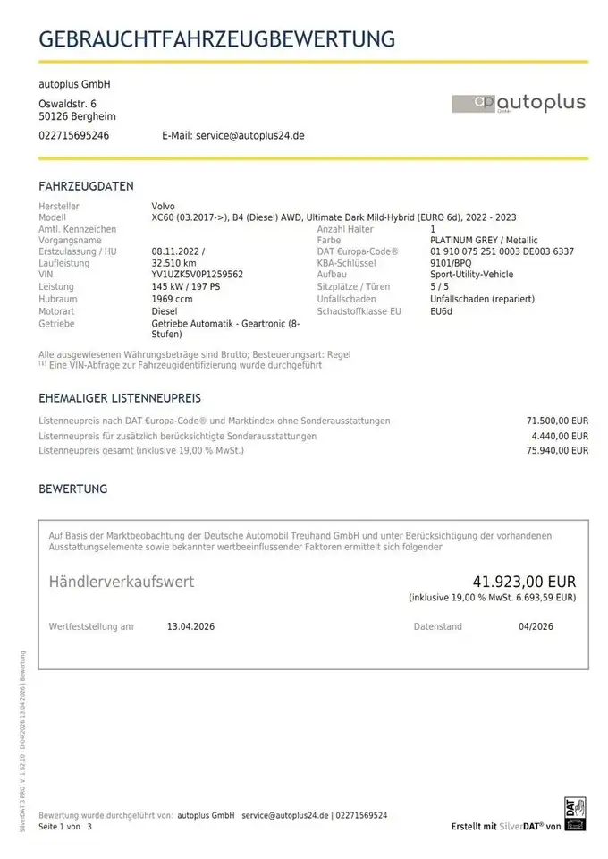 Volvo XC60 B4 (D) Ultimate Dark AWD AHK WinterPkt Pano — понятный вариант под заказ для спокойной покупки с заранее понятным расчетом: 2022 год, пробег 32 626 km, automatyczna, 197 л.с. Перед покупкой проверим продавца, документы, состояние по фото и комплектацию, а затем подготовим расчет поставки под ключ.